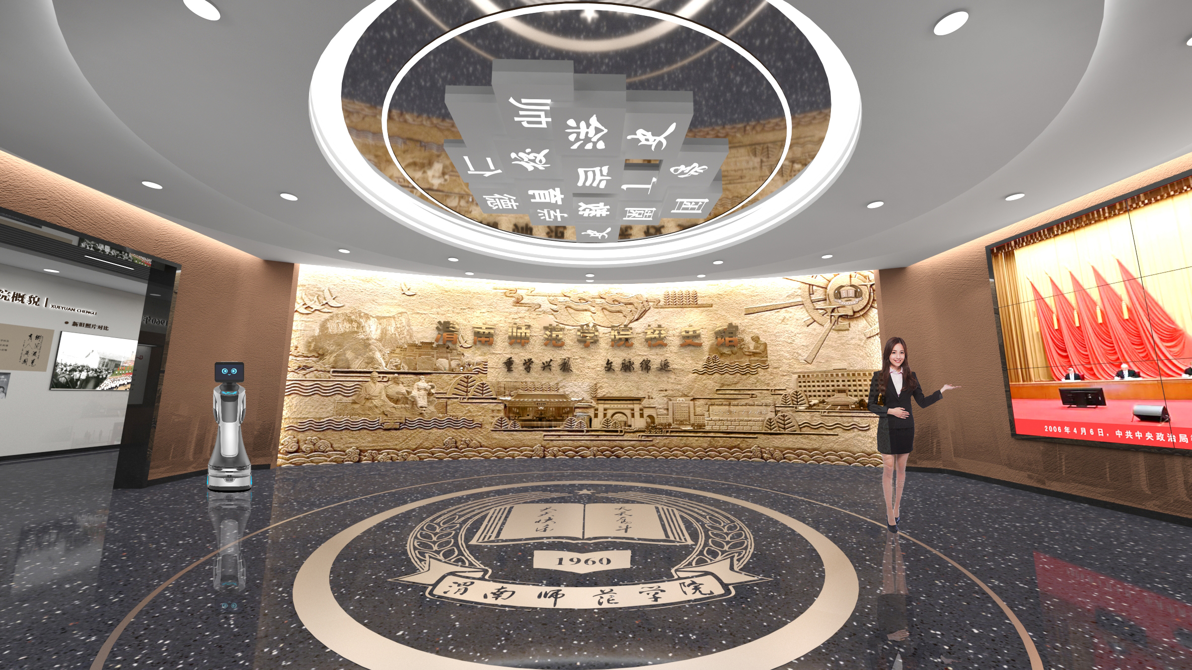 项目以时间为轴、师范为魂,规划五大核心展区,全景呈现学校从 1960 年初创、两校合并升本、多校区发展到省市共建的辉煌历程。通过图文展板、实物陈列、数字沙盘、全息投影、幻影成像、场景还原、沉浸式体验等多元形式,还原办学初心、定格发展瞬间、彰显教育成就,让校史可看、可听、可触摸、可感悟,成为渭师思政育人、文化传承、校友交流的核心阵地。